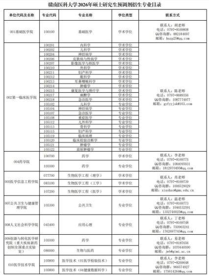 根据2026年硕士研究生招生考试初试国家分数线及我校一志愿考生上线情况,学校相关专业拟接收部分调剂考生,实际调剂学科专业及人数以调剂系统公布为准。一、接收调剂要求1.必须符合《赣南医科大学2026年硕士研究生招生简章》中规定的调入专业的报考条件。2.初试成绩必须达到第一志愿报考专业的国家A类地区分数线以及我校各招生单位确定的调入专业最低复试分数线(包含单科和总分)。3.调剂考生第一志愿专业原则上应与调入专业相同相近,或初试科目与调入专业初试科目相同相近,并符合我校在调剂系统公布的调剂专业范围及相关要求。二、调剂