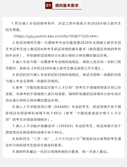 根据我校2026年硕士研究生招生计划及一志愿复试录取情况,我校部分学科专业(方向)可接受调剂。现将我校调剂工作有关事项通知如下,欢迎各位考生积极申请我校调剂:一、调剂基本要求1.符合调入专业的报考条件,详见江西中医药大学2026年硕士研究生招生简章(网址:https://yjsy.jxutcm.edu.cn/info/1028/17225.htm)。2.初试成绩符合第一志愿报考专业在教育部2026年全国硕士研究生招生考试考生进入复试的A类考生初试成绩的基本要求(除有规定其他的条件的专业外),并依据初试成绩总分从高分到低分择优确定复试名单。3.调入专业与第一志愿