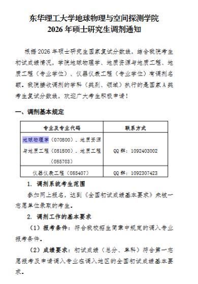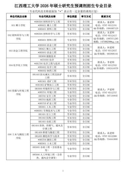 根据2026年硕士研究生招生考试初试国家分数线及我校一志愿考生上线情况,学校相关专业拟接收部分调剂考生,实际调剂学科专业及人数以调剂系统公布为准。一、接收调剂要求1.必须符合《江西理工大学2026年硕士研究生招生简章》中规定的调入专业的报考条件。2.初试成绩必须达到第一志愿报考专业的国家A类地区分数线以及我校各招生单位确定的调入专业最低复试分数线(包含单科和总分)。3.调剂考生第一志愿专业原则上应与调入专业相同相近,或初试科目与调入专业初试科目相同相近,并符合我校在调剂系统公布的调剂专业范围及相关要求。4.我校“