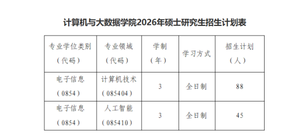 根据教育部、省教育厅和我校有关文件精神,以及《莆田学院2026年硕士研究生招生复试录取工作办法》有关规定,经我院研究生招生工作领导小组研究,制定本复试录取实施细则。一、招生计划专业学位类别(代码)专业领域(代码)学制学习方式招生计划是否需要调剂生电子信息(0854)通信工程(085402)3年全日制5名详见后续调剂公告人工智能(085410)3年全日制5名是二、复试分数线及差额复试比例1.复试分数线:按2026年全国硕士研究生招生考试考生进入复试的初试成绩(含加分,下同)基本要求的一区(A类)考生国家线执行。2.差额复试比例:复