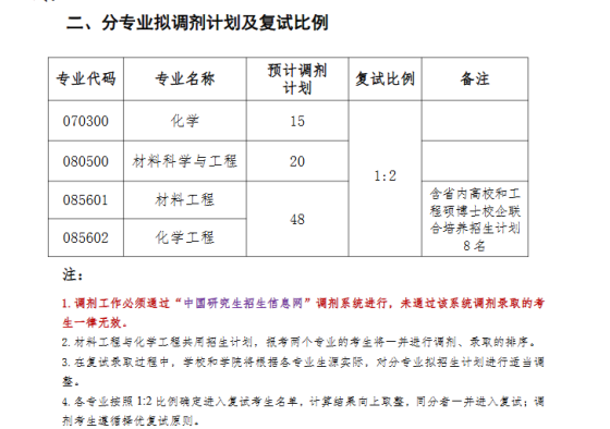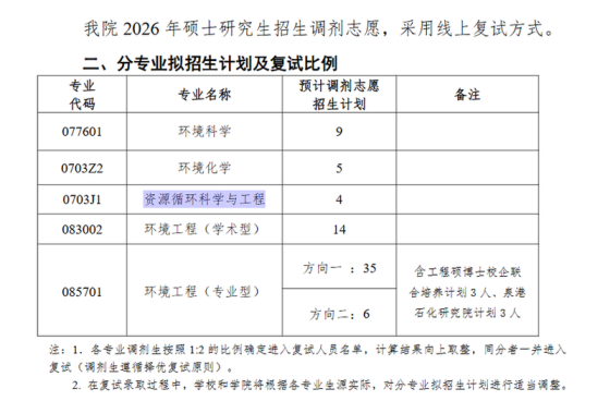 根据《2026年全国硕士研究生招生考试考生进入复试的初试成绩基本要求》,结合我校招生计划及一志愿生源情况,现将我校拟接收调剂学科(专业)予以公布。请有意调剂的考生提前了解我校和各学科(专业)调剂政策,按国家调剂要求、我校复试录取办法、二级单位复试录取实施细则等规定进行调剂申请。一、调剂申请方式我校通过“全国硕士研究生招生考试网上调剂服务系统(https://yz.chsi.com.cn/yztj/)”受理考生申请调剂,不接收系统外的任何申请形式。实际接收调剂学科(专业)及调剂系统开通时间、调剂缺额等信息以“全国硕士研究生招生调