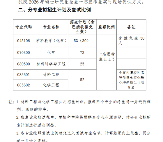 【一志愿名单】化学与材料学院2026年硕士研究生招生参加复试考生名单对比以上数据: 化学,080500材料科学与工程,085601材料工程,085602化学工程,一志愿上线人数不足结合自己的情况,积极准备,如需删除请联系电话18137782070温馨提示:推荐使用51考研网电脑站官网查看信息更方便 www.51kywang.com