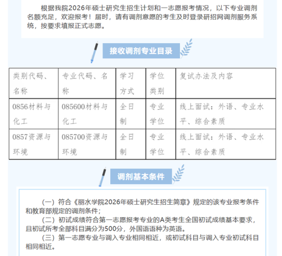 2026年我校硕士研究生招生考试各专业复试分数线已经公布,以下招生专业尚有缺额,具体情况如下:说明:1.具体调剂要求、调剂缺额等信息详见“全国硕士生招生调剂服务系统”。2.一志愿考生复试结束后,可能还有部分其他专业需要调剂,请考生及时关注“全国硕士生招生调剂服务系统”查询,各专业调剂情况以实际招生为准