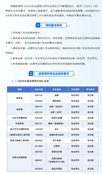 根据《浙江农林大学2026年硕士研究生复试录取工作方案》并结合我院实际,特制定2026年硕士研究生复试录取工作实施细则。一、工作原则1.坚持科学选拔。积极探索并遵循高层次专业人才选拔规律,采用多样化的考查方式方法,确保生源质量。2.坚持公平公正。做到政策透明、程序公正、结果公开、监督机制健全。严格执行国家政策规定,不得按考生所在单位、行业、地域、学校层次类别等非学业水平标准限定生源范围,不得设置其他歧视性条件。3.坚持全面考查。在对考生德智体等各方面考查基础上,突出对创新能力、专业素养和综合素质等方面的考查。