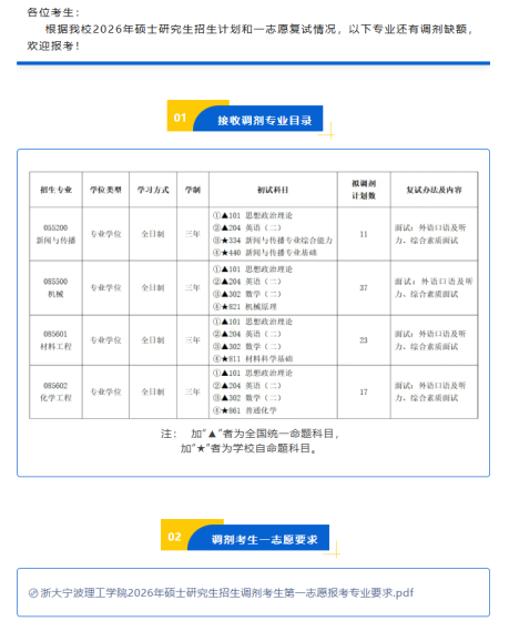 一、调剂信息专业学位代码专业学位名称调剂计划0856材料与化工40二、调剂基本条件1、符合调入专业的报考条件初试总成绩、初试单科均达到国家教育部规定的A类考生进入复试的基本要求。2、第一志愿报考专业与调入专业相同或相近。3、初试科目与调入专业初试科目相同或相近,其中初试全国统一命题科目为数学一或数学二、英语一或英语二。三、调剂专业和科目确定原则1、调剂到本专业考生的一志愿报考专业为:0703化学、0802机械工程、 0803 光学工程、 0804 仪器科学与技术、 0805 材料科学与工程、 0806 冶金工程 、0807 动力工程及工程热物理