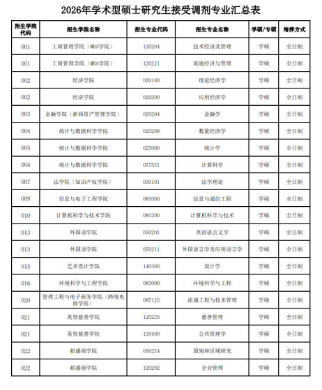 根据《浙江工商大学2026年硕士研究生分专业招生计划、复试分数线》及一志愿复试录取情况,我校部分专业接收调剂。调剂工作将在“全国硕士研究生招生考试复试调剂服务系统”(https://yz.chsi.com.cn/yztj/)4月8日正式开通后启动,请考生密切关注。届时,请有调剂意愿的考生及时登录“调剂服务系统”,按要求填报正式志愿。各专业调剂要求详见《浙江工商大学2026年硕士研究生招生复试录取办法》及相关学院调剂公告。一、2026年硕士研究生接收调剂专业汇总表浙江工商大学2026年硕士研究生接收调剂专业汇总表20260403.pdf二、关于考生调剂的