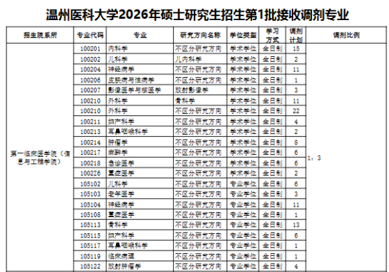 根据《温州医科大学2026年硕士研究生招生复试录取工作方案》,并结合各培养单位一志愿复试录取情况,我校开始接收调剂考生,具体安排如下。一、调剂信息“全国硕士研究生招生调剂服务系统”(以下简称“调剂系统”)将于4月8日开通,我校第1批接收调剂的专业和缺额情况详见下表。如个别专业生源不足,后期将对其招生计划进行调整。
