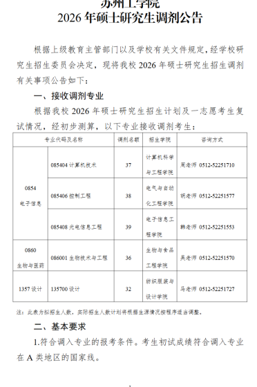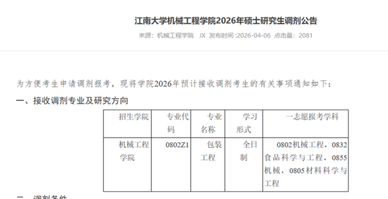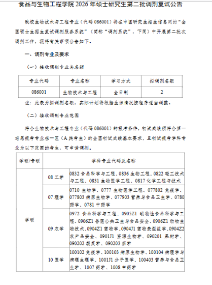 根据《教育部关于印发2026年全国硕士研究生招生工作管理规定的通知》(教学〔2025〕2号)及《南京工业大学2026年硕士研究生复试录取工作办法》等文件要求,现将我校2026年调剂复试有关事项通知如下:一、调剂申请条件1.调剂考生第一志愿专业与调入专业相同或相近;初试统考科目与调入专业初试统考科目相同(201-英语一和204-英语二视为相同; 301-数学一、302-数学二、303-数学三、314-数学(农)和396-经济类综合能力视为相同)。拟调剂人数等具体信息详见我校后续发布的调剂需求公告。2.非全日制硕士研究生需以定向就业形式申请调剂,就读期