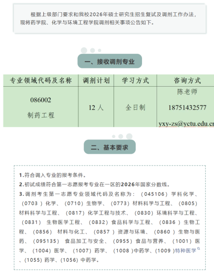 根据教育部《2026年全国硕士研究生招生工作管理规定》(教学〔2025〕2号)、《中国药科大学2026年招收硕士研究生复试、录取工作办法》(药大研函〔2026〕8号)文件精神,结合我校实际情况,制定2026年硕士研究生调剂工作实施细则。一、调剂基本原则1、我校接收调剂考生的学科专业,仅限于第一志愿合格生源不足的学科专业。2、全日制学术学位硕士研究生专业调剂,接收相同或相近的学术学位专业考生。3、全日制专业学位硕士研究生专业调剂,接收相同或相近的学术学位专业考生或专业学位类别考生。4、我校接收调剂考生的学科专业,按照调剂计