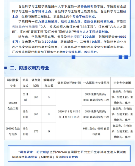 根据教育部、江苏省以及学校有关文件规定,现将我院2026年硕士研究生招生调剂事项通知如下:一、接收调剂的学科及专业领域专业类别专业领域调剂名额调剂考生第一志愿专业范围0859土木水利085905市政工程(含给排水等)20859土木水利、081403市政工程、0857资源与环境、0830环境科学与工程、0802机械工程、0812计算机科学与技术、0815水利工程、0817化学工程与技术、0828农业工程、0854电子信息、0856材料与化工、0855机械、0703化学、0709地质学、0710生物学、0713生态学、0775计算机科学与技术、0776环境科学与工程、0903农业资源与环境、
