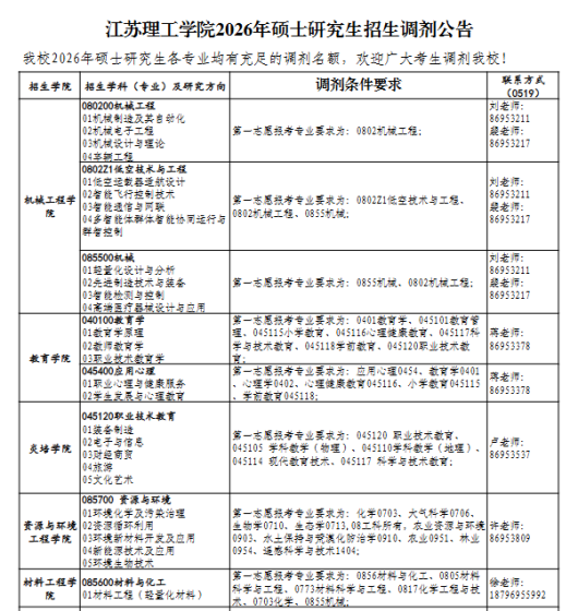 根据《教育部关于印发2026年全国硕士研究生招生工作管理规定的通知》(教学〔2025〕2号)、教育部、省教育厅关于2026年硕士研究生复试录取工作的相关文件及会议精神及《淮安大学(原淮阴工学院)2026年硕士研究生复试录取工作办法》,结合我校实际,现将调剂有关事项公告如下:一、接收调剂专业学院代码学院名称专业(领域)代码、名称及研究方向第一志愿专业范围拟调剂名额联系方式001化学工程学院085600材料与化工0856材料与化工、0805材料科学与工程、0806冶金工程、0807动力工程及工程热物理、0817化学工程与技术、0819矿业工程、0820