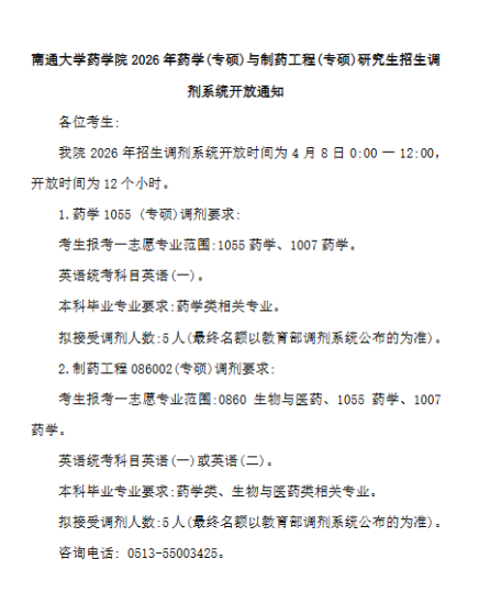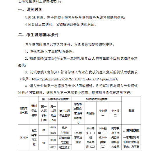 根据教育部、江苏省以及学校有关文件规定,现将我校2026年硕士研究生接收调剂事项通知如下:一、调剂基本条件1. 符合调入专业的报考条件。2. 初试成绩符合第一志愿A类考生的全国初试成绩基本要求及我校硕士研究生复试分数线。3. 调入专业应与第一志愿报考专业相同相近,初试科目与调入专业初试科目相同相近。4. 第一志愿报考工商管理、公共管理、旅游管理、会计、图书情报、工程管理、审计专业学位硕士的考生,在满足调入专业报考条件且初试成绩同时符合调出专业和调入专业在调入地区的全国初试成绩基本要求的基础上,可申请相互调剂,但不