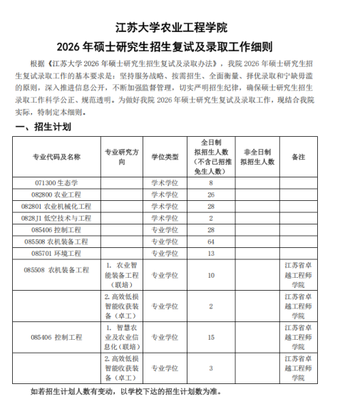 附件【2026年农业工程学院硕士研究生复试录取工作细则.pdf】附件【附件1:农业工程学院具有复试资格名单公示(一志愿).pdf】对比以上数据: 农业工程,082801农业机械化工程,0828J1低空技术与工程,085406控制工程,085701环境工程,一志愿上线人数不足结合自己的情况,积极准备,如需删除请联系电话18137782070温馨提示:推荐使用51考研网电脑站官网查看信息更方便 www.51kywang.com