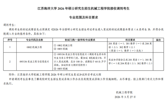根据教育部、江苏省2026年硕士研究生招生有关规定,为做好我院2026年硕士研究生调剂录取工作,有关事项公告如下:一、调剂专业及数量1.土木工程(岩土工程,结构工程,市政工程,防灾减灾工程及防护工程,桥梁与隧道工程),17名。2.水利工程(水文学及水资源,水力学及河流动力学,水利水电工程,水工结构工程,港口、海岸及近海工程,智慧水利,现代农业水利工程),17名。3.材料科学与工程,4名。4.环境科学与工程,5名。5.土木水利(土木工程、水利工程、农田水土工程),11名。6.与河海大学联培8名,水利工程(水文学及水资源3名,水