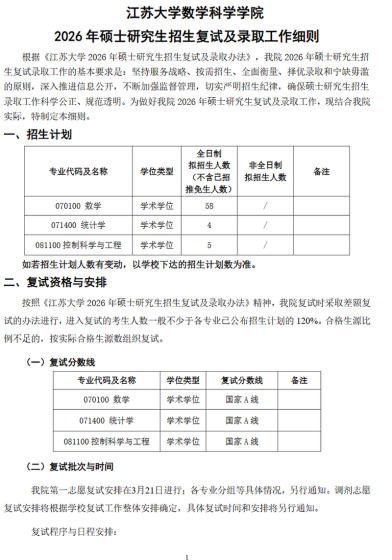 根据2026年全国硕士研究生招生考试考生进入复试的初试成绩基本要求,经南京水利科学研究院研究生招生委员会批准同意,现将我院2026年复试分数线(见附件1)和复试人员名单(见附件2)公布。我院一志愿复试和调剂复试均采取现场复试方式,其中一志愿复试面试从2026年3月20日起陆续开始。复试办法将通过我院研究生网站和“南京水利科学研究院研究生院”微信公众号发布,具体安排会有考务老师联系您,请符合我院复试成绩基本要求的考生密切关注,认真备考,耐心等待后续通知。联系人:沙老师电 话:025-85828895E-mail:yjsb@nhri.cn附件1:2