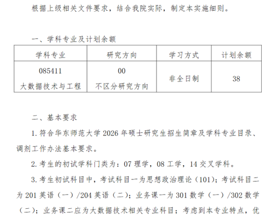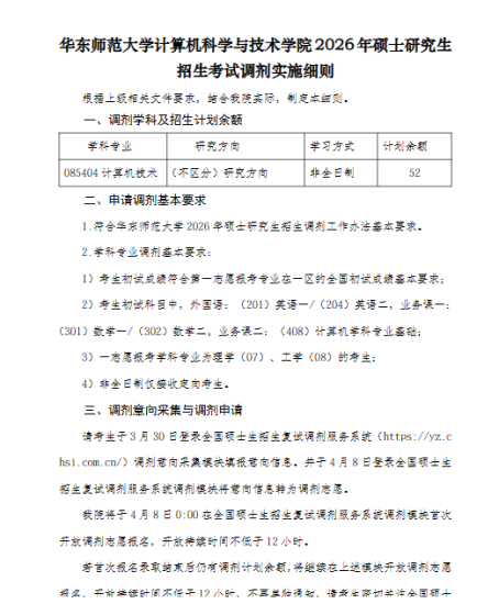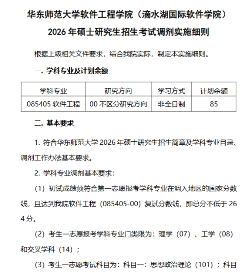 根据上级相关文件要求,结合我院实际,制定本实施细则。一、学科专业及计划余额学科专业研究方向学习方式计划余额085402通信工程(含宽带网络、移动通信等)00不区分研究方向非全日制40085403集成电路工程02通用项目(非全)非全日制18二、基本要求1、符合华东师范大学2026年硕士研究生招生简章及学科专业目录、调剂工作办法基本要求。2、学科专业调剂基本要求:(1)考生初试成绩符合第一志愿报考专业在A区的全国初试成绩基本要求;(2)考生初试科目二应为英语一或英语二;业务课一应为数学一或数学二;业务课二为电子信息相关考试科目,