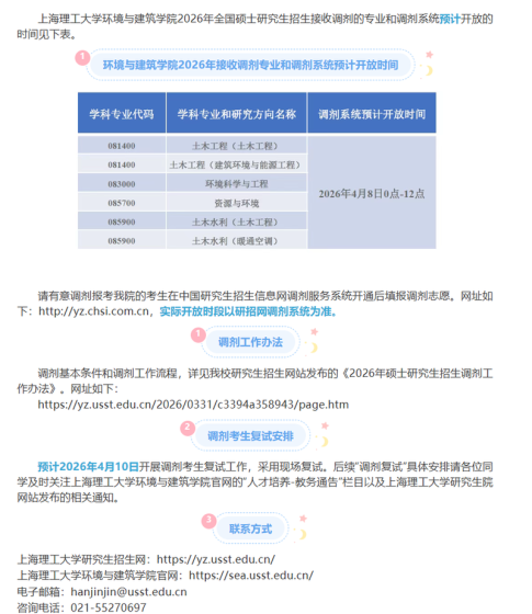 上海理工大学管理学院2026年全国硕士研究生招生接收调剂的专业有(不含专业学位中心):071100 系统科学082300 交通运输工程085410 人工智能(专业学位)以上专业调剂系统预计2026年4月8日0点开放,开放时间原则上不少于12 小时;具体开放时间以中国研究生招生信息网为准。请有意调剂报考我院的考生在中国研究生招生信息网调剂服务系统开通后,查看缺额信息并填报调剂志愿。网址如下:http://yz.chsi.com.cn一、调剂工作办法调剂基本条件和调剂工作流程,详见我校研究生招生网站发布的《2026年硕士研究生招生调剂工作办法》。网址如下:202
