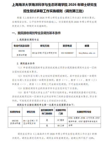 根据《教育部关于印发2026年全国硕士研究生招生工作管理规定的通知》(教学〔2025〕2号),《关于做好2026年全国硕士研究生复试录取工作的通知》(教学司〔2026〕3号),《上海市2026年全国硕士研究生复试录取工作管理规范》(沪教考院社考〔2026〕5号)等相关工作要求,结合我校工作实际,坚持“公平、公正、公开”的原则,科学、规范制定调剂工作办法如下:一、调剂时间第一条调剂系统为“全国硕士生招生调剂服务系统”,“网上调剂意向采集系统”于3月27日开通,“调剂服务系统”将于4月8日开通,调剂工作同步启动。请有调剂意愿的考生