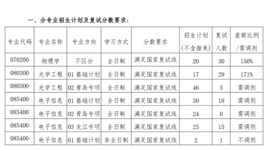 一、分专业招生计划及复试分数要求专业代码专业名称专业方向学习方式分数要求招生计划(不含单考)复试人数差额比例070206声学基础计划全日制满足国家线92需调剂070700海洋科学青岛专项全日制满足国家线101需调剂081000信息与通信工程(士兵计划)基础计划全日制符合学校“退役大学生士兵”计划分数线33100%081000信息与通信工程基础计划全日制满足国家线且总分不低于300分614233%081000信息与通信工程(士兵计划)青岛专项全日制符合学校“退役大学生士兵”计划分数线11100%081000信息与通信工程青岛专项全日制满足国家线3432需调剂08100