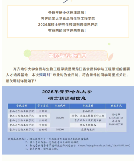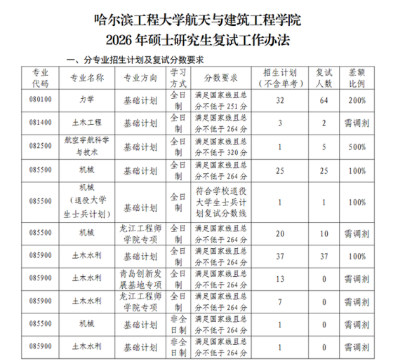 一、接收调剂专业及方向信息二、调剂复试基本要求(1)分数:初试成绩总分、单科分均达到教育部规定的A类地区2026年全国硕士研究生招生考试进入复试的初试成绩基本要求。(2)本科毕业专业限制目录清单详见研招网意向征集系统。(3)调剂考生第一志愿专业为08工学,初试科目包含数学一或数学二。(4)通过大学外语四级并符合初试外语语种要求。(5)符合教育部其他调剂政策。三、调剂咨询联系方式调剂咨询邮箱:nepu_jzx@163.com联系电话:0459-6504343联系人:1、081400土木工程,085901土木工程(专业学位):卢老师13199059219,QQ群:
