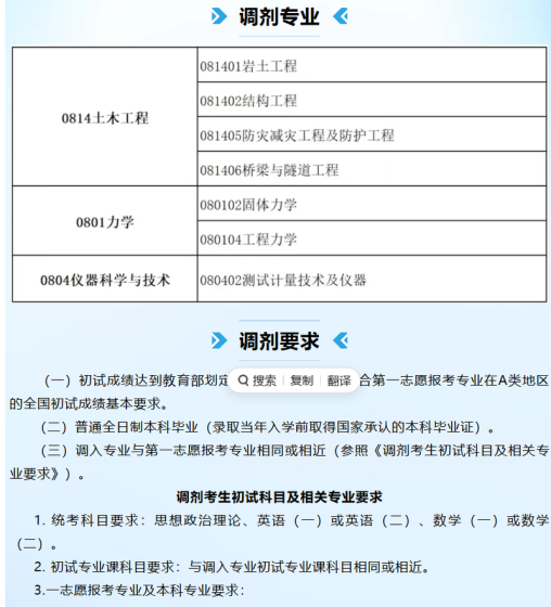 我院2026年机械工程(0802)、农业工程(0828)、农业工程与信息技术(095136)、低空技术工程(0828J1)硕士研究生招生尚有部分名额,请有意向调剂的考生关注调剂系统并按时填报。 一、调剂基本条件 (一)符合《黑龙江八一农垦大学2026年硕士研究生招生简章》中调入专业的报考条件。同时应满足下列条件: 1.第一志愿专业范围 (1)机械工程(0802)调剂专业范围:力学(0772)、电子科学与技术(0774)、农业工 程(0828)、机械工程(0802)、机械(0855)、力学(0801)、材料科学与工程(0805)、电气工程(0808)、信息与