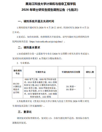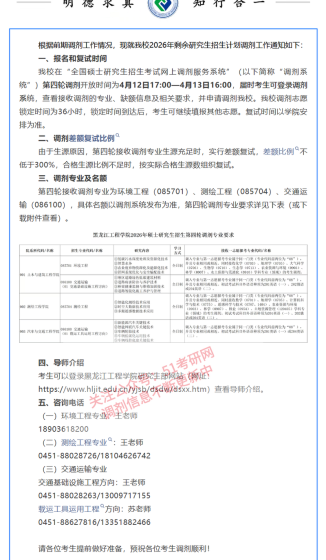 我校在“全国硕士研究生招生考试网上调剂服务系统”第三轮调剂开放时间为4月12日18:00—4月13日8:00,届时考生可登陆调剂系统,查看接收调剂的学科,按照我校2026年调剂政策和要求自主报名。4月13日8:00后将统一陆续查看并对符合条件的考生发送复试通知,我校调剂志愿锁定时间为36小时(志愿锁定期间不接受考生解锁申请,请谨慎报名),考生接到复试通知后请尽快回复。如超过调剂解锁时间,而考生未收到复试通知,可选择继续保留调剂志愿或更改调剂志愿到其他学校。每名考生每一轮次只能申请我校一个调剂学科专业,每一轮次调剂过程中申请