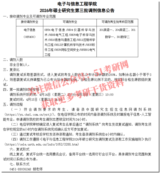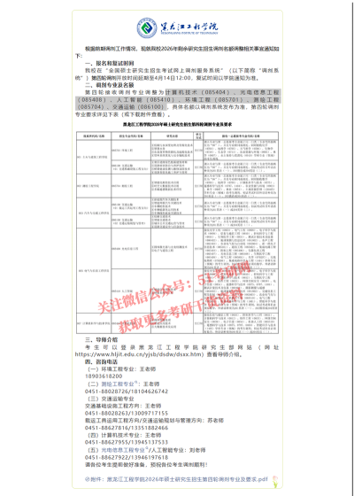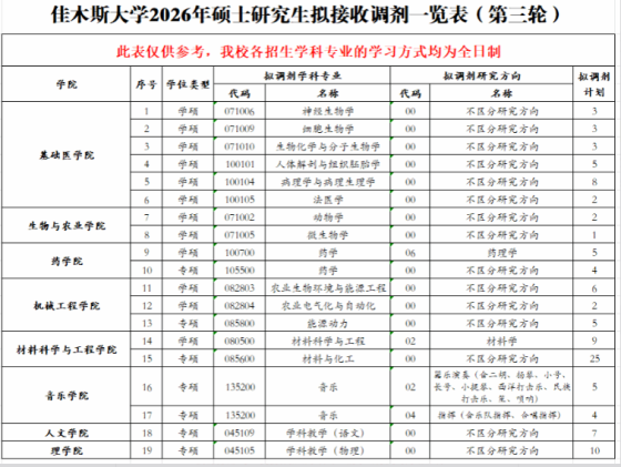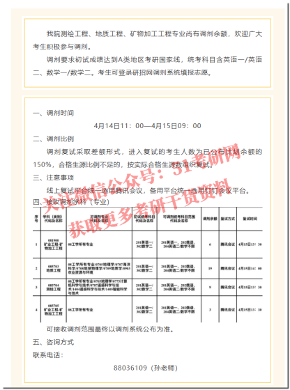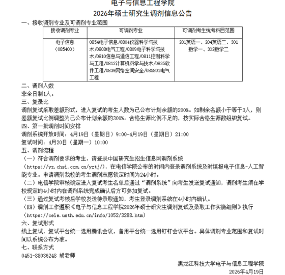 我校部分专业接收调剂:专业硕士专业:日语笔译、生物与医药、环境工程、测绘工程;开放时间为4月17日15时至4月19日15时,请各位考生登录全国硕士研究生招生考试网上调剂系统查看专业及缺额信息。研招办根据考生信息,于24小时内确定是否接收调剂,并在调剂系统中对拟接收的考生发放复试通知,请于4小时内,同意接受我校复试通知,否则取消复试资格。接收到复试通知的考生请保证报名时预留手机畅通,招生学院将联系考生,通知复试相关事宜。