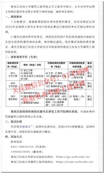 一、复试专业:土木工程(0814)、土木水利(0859)二、复试开始时间:4月15日13:30(具体时间以调剂系统发布为准)三、复试形式:腾讯会议(线上)四、调剂开放时间:4月14日14:45-4月15日8:30五、调剂余额:土木工程(0814):9人;土木水利(0859):7人(含龙江工程师4人)。六、复试比例:1:2七、可接收调剂的专业(见下表)接收调剂学科(专业)学科(专业)方向可接收调剂范围学科(专业)0814土木工程01岩土工程02结构工程03防灾减灾工程及防护工程08工学;07理学;1201管理科学与工程0859土木水利01土木工程08工学;07理学;12