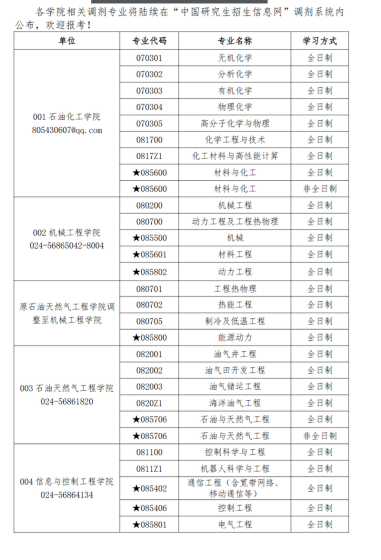 经学校研究,我校以下专业预计可接收部分调剂考生,现将有关事项通知如下:一、拟接收调剂专业 (一)全日制专业 (二)非全日制专业二、时间安排 1.符合条件考生须在“调剂服务系统”开通后的12小时内登录中国研究生招生信息网“调剂服务系统”完成调剂志愿信息填报。 注:“调剂服务系统”预计将于4月8日0时(具体以研招网为准)开通,若时间有调整,后续时间相应顺延。 2.志愿填报结束后,学校将对申请调剂考生进行审核,并于4月8日18:00时前在“调剂服务系统”向调剂考生发放复试通知。 3.申请调剂考生须在收到同意复试通知后,按