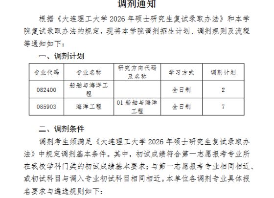 我校一志愿复试录取工作已结束,学校拟定于2026年4月2日17:00前开通研招网“调剂意向采集系统”,公布《大连海洋大学2026年全国硕士研究生招生调剂复试录取工作办法》及《大连海洋大学2026年全国硕士研究生招生接受调剂考生一志愿专业范围等学术要求及遴选规则》。我校各专业调剂第一批次计划余额(普通计划+退役士兵专项计划)见附件。附件:大连海洋大学2026年全国硕士研究生招生调剂第一批次计划余额.pdf