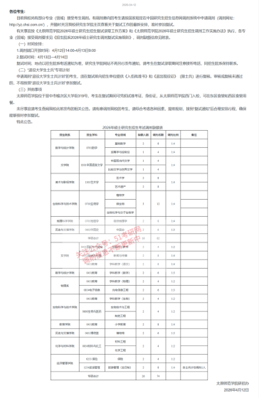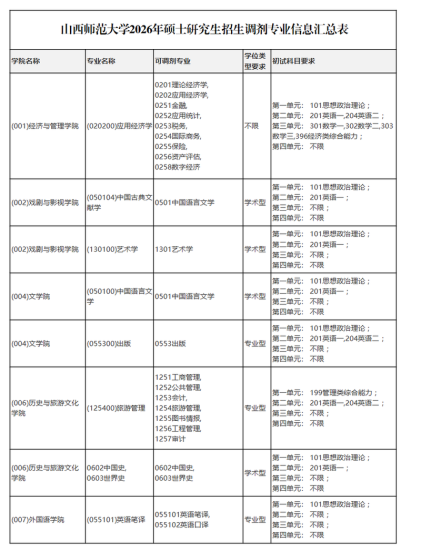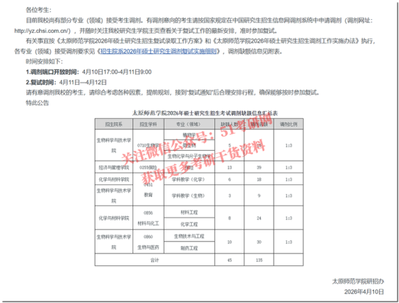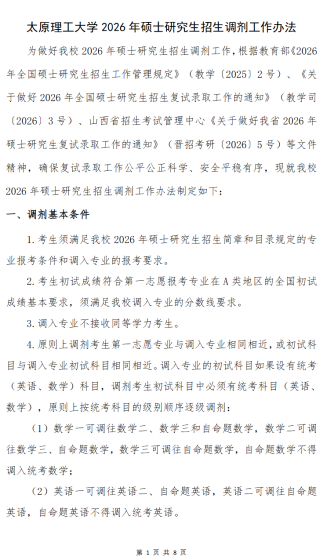 根据教育部《关于印发2026年全国硕士研究生招生工作管理规定的通知》(教学〔2025〕2号)、《关于做好2026年全国硕士研究生招生复试录取工作的通知》(教学司〔2026〕3号)及山西省招生考试管理中心《关于做好我省2026年硕士研究生复试录取工作的通知》(晋招考研〔2026〕5号)等文件要求,为进一步做好我校硕士研究生招生调剂工作,特制定本公告。一、调剂基本条件(一)符合我校2026年硕士研究生招生简章目录中规定的调入专业的报考条件及我校本年度相关调剂专业的具体要求。(二)初试成绩符合第一志愿报考专业在A类地区的进入复试的初