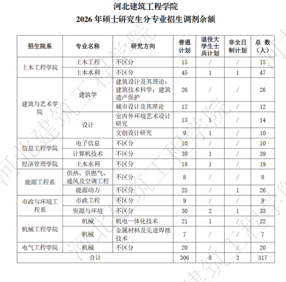 1.我校目前接收调剂硕士研究生招生专业见下表所示。2.考生4月8日在“中国研究生招生信息网”(https://yz.chsi.com.cn/)调剂系统开通后,登录提交调剂信息。3.《河北工程大学2026年硕士研究生招生调剂工作办法》已在我校研究生部网站发布,请考生关注,按具体要求进行调剂。4.调剂期间请考生随时关注我校研究生部网站和各招生学院网站的有关通知。调剂专业如有调整,以具体通知为准。5.相关专业调剂学术要求请参考《河北工程大学2026年硕士研究生复试分专业调剂学术要求》(附件)。以上要求仅供参考,以调剂系统发布为准。附件:河北工程