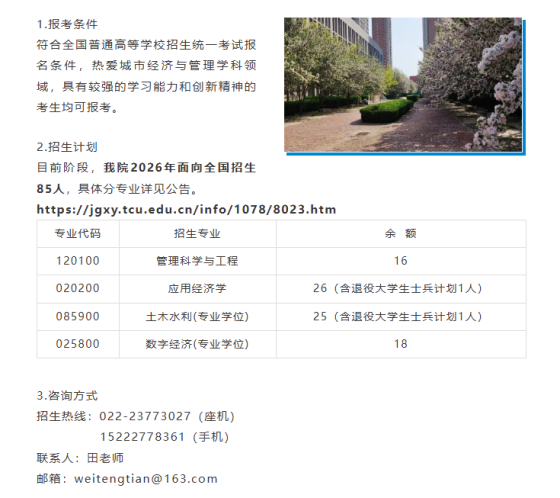根据一志愿考生上线情况,我校部分专业需接收调剂。调剂要求请见《天津财经大学2026年硕士研究生调剂办法》,相关调剂信息如下:一、招生专业调剂信息院系所专业学术型/专业学位调剂信息学院联系电话001经济学院020100理论经济学学术型全日制及少干计划022-88186271王老师020206国际贸易学学术型全日制020207劳动经济学学术型全日制002财税与公共管理学院120400公共管理学(社会保障方向)学术型全日制及少干计划022-28160161郭老师125200公共管理专业学位非全日制003金融学院025500保险专业学位全日制022-88186264李老师004商学院020202区