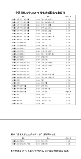 根据我校2026年硕士研究生招生计划和一志愿考生录取情况,部分学科专业尚有计划缺额,欢迎广大考生调剂报考,现将有关事项通知如下。一、调剂专业依据中国民航大学2026年硕士研究生招生考试考生进入复试的初试成绩基本要求,我校拟接收调剂的专业信息详见附件内容,具体接收调剂专业及调剂名额等信息以调剂系统公布为准。二、分数要求我校硕士研究生招生复试基本分数线依据“2026年全国硕士研究生招生考试考生进入复试的初试成绩基本要求”划定,经学校研究生招生委员会审议确定。1.普通计划复试基本分数线考生初试成绩(总分和单科成绩)