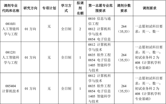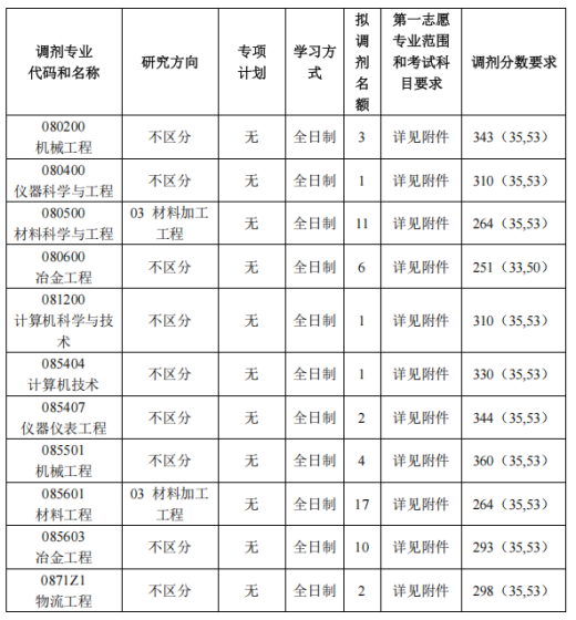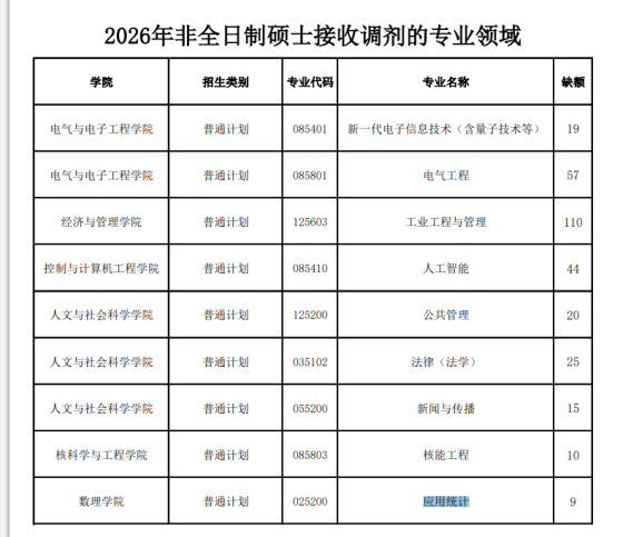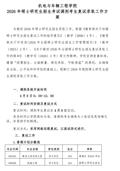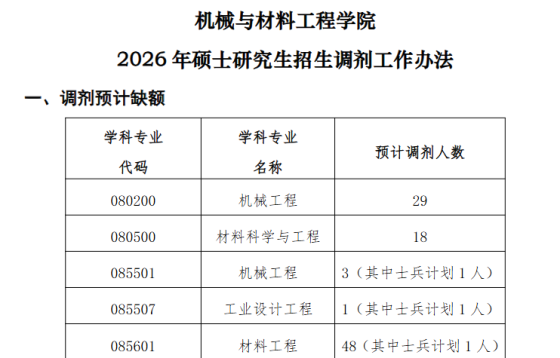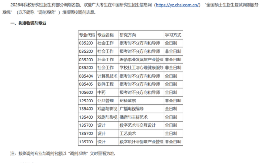 根据教育部公布2026年全国硕士研究生招生考试考生进入复试的初试成绩基本要求及我校复试分数线,我校个别专业尚有缺额可以接收调剂,现就接收调剂相关事宜通知如下:一、调剂基本条件1.须符合招生章程中规定的调入专业的报考条件。2.初试成绩符合第一志愿报考专业在一区的全国初试成绩基本要求,并且满足我校调入专业考生进入复试的初试成绩基本要求。3.原则上,调剂考生第一志愿专业与调入专业相同相近,且在同一学科门类范围内。4.考生初试科目应与调入专业初试科目相同或相近,且英语(一)可调英语(二),数学(一)可调数学(二)、