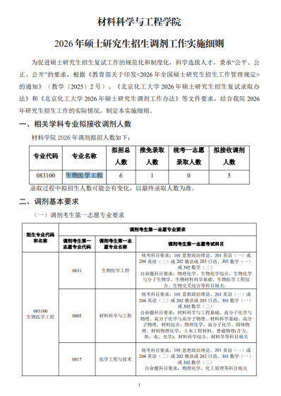 根据《教育部关于印发2026年全国硕士研究生招生工作管理规定的通知》(教学函〔2025〕2号),及我校一志愿考生复试情况,我校2026年有少部分专业拟接收考生调剂。具体专业调剂计划余额以中国研究生招生信息网(https://yz.chsi.com.cn/)“全国硕士生招生复试调剂服务系统”(以下简称“复试调剂系统”)公布的调剂信息为准,请及时关注。一、调剂办法我校调剂工作原则、基本要求等请查看《北京工业大学2026年硕士研究生招生复试、录取工作安排》《北京工业大学各学院2026年硕士研究生复试录取工作方案(含调剂办法)》。所有调剂工作均通