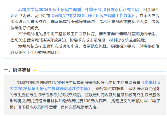 根据教育部、北京市及《中国农业科学院2026年硕士研究生调剂工作办法》等有关文件要求,结合我所第一志愿统考生招录情况,加工所拟招收调剂考生,欢迎相关考生申请调剂。一、调剂基本原则(一)坚持“服务考生,择优选拔”的原则,调剂考生的复试形式、内容、程序、录取标准与第一志愿考生相同。(二)所有调剂考生均需通过教育部“全国硕士生招生调剂服务系统”(以下简称“调剂服务系统”)进行申请,并接收、确认有关通知。二、调剂时间“调剂服务系统”开通时间为4月8日,开放调剂系统持续时间不低于12小时,关闭系统时间视调剂生源情况