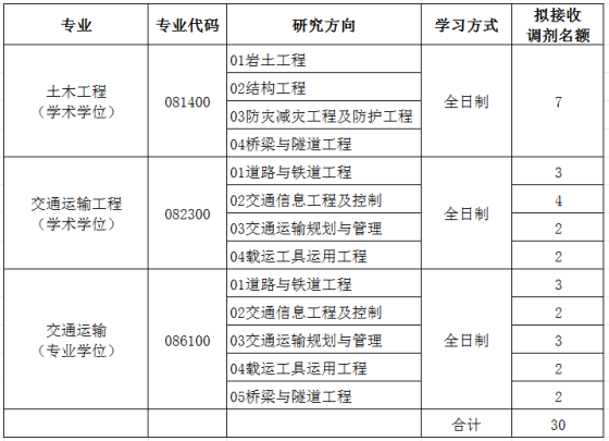 单位名称:交通运输部公路科学研究所单位代码:83902一、接收调剂专业及接收调剂名额1.土木工程081400(学术学位,研究方向:01岩土工程、02结构工程、03防灾减灾工程及防护工程、04桥梁与隧道工程;拟接收调剂共7名)。2.交通运输工程082300(学术学位,研究方向:01道路与铁道工程、02交通信息工程及控制、03交通运输规划与管理、04载运工具运用工程;拟接收调剂共11名)。3.交通运输086100(专业学位,研究方向:01道路与铁道工程、02交通信息工程及控制、03交通运输规划与管理、04载运工具运用工程、05桥梁与隧道工程;拟接收调剂共12