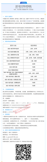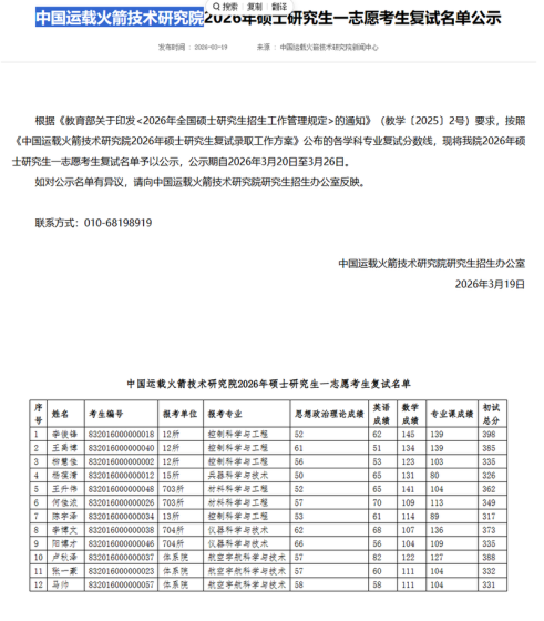 中国运载火箭技术研究院2026年硕士研究生统考招生专业目录根据我院现阶段推免生实际录取情况,现公布我院2026年硕士研究生统考招生专业目录,请各位考生按照统考招生专业目录中的招生计划进行网上报名。我院部分培养单位的推免生招生工作仍在进行中,截止时间为10月20日。若后续我院推免生录取人数及统考招生计划发生变化,我院将在10月22日前对变动后的统考招生专业目录另行公布。学科、专业名称(代码)研究方向招生人数考试科目培养单位0802机械工程(学术学位)3318所01机电系统控制及自动化02机器人技术与系统30①101思想政治理论②2