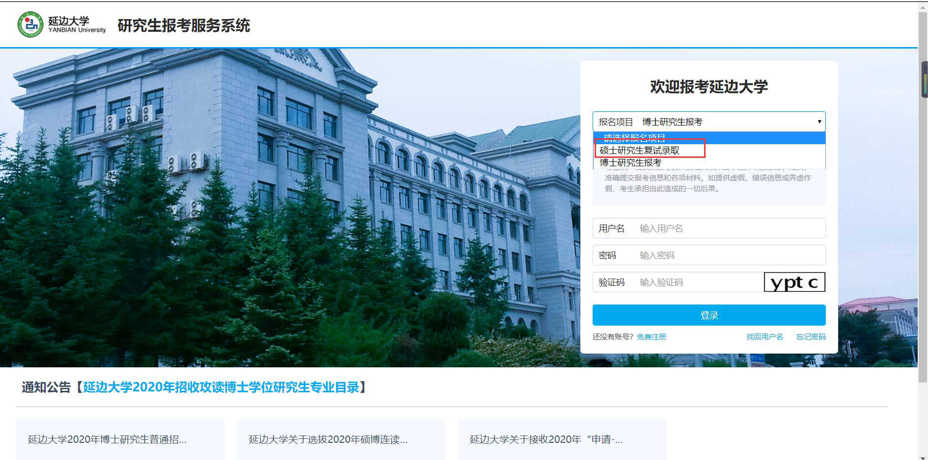选择硕士研究生复试录取,用户名是考生编号,密码是身份证全部