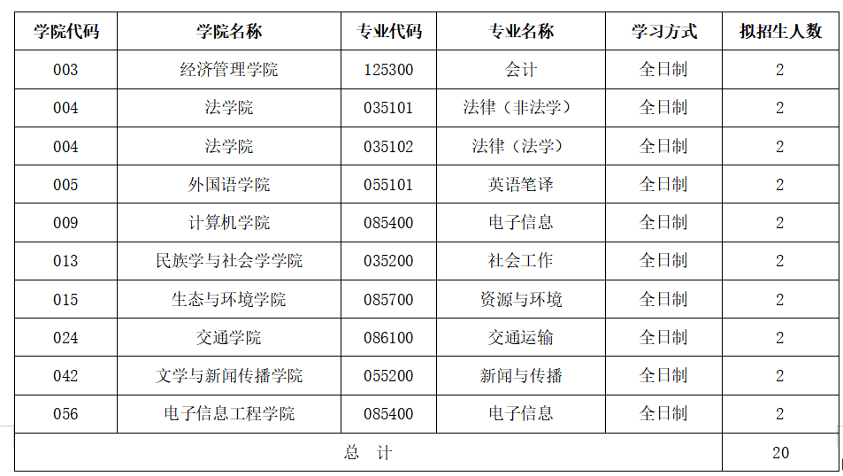 专业学位:应用统计(专业代码025200)、法律(非法学)(专业代码035101)、非全日制法律(法学)(专业代码035102)、电子信息(专业代码085400)、材料与化工(专业代码085600)、资源与环境(专业代码085700)、生物与医药(专业代码086000)、交通运输(专业代码086100)、工商管理(专业代码125100)、公共管理(专业代码125200)、旅游管理(专业代码125400),学制3年;其他专业学位学制2年。