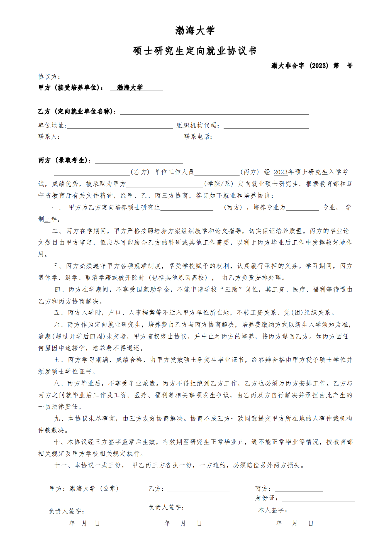 (五)被录取为定向就业的考生,须在学校规定的时间前,向渤海大学研究生院提交《定向就业协议书》。如无法提供或提供不合格材料,所产生的一切后果由考生承担。我校非全日制硕士研究生仅招收定向就业方式的考生。