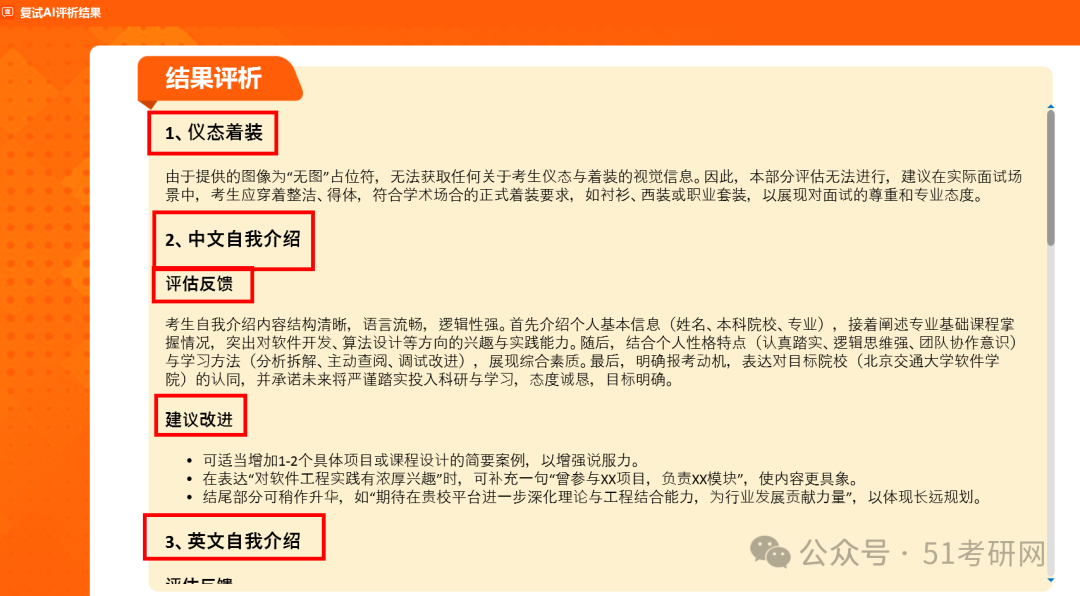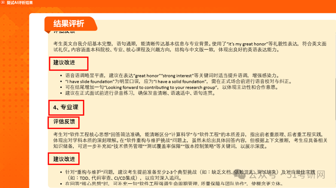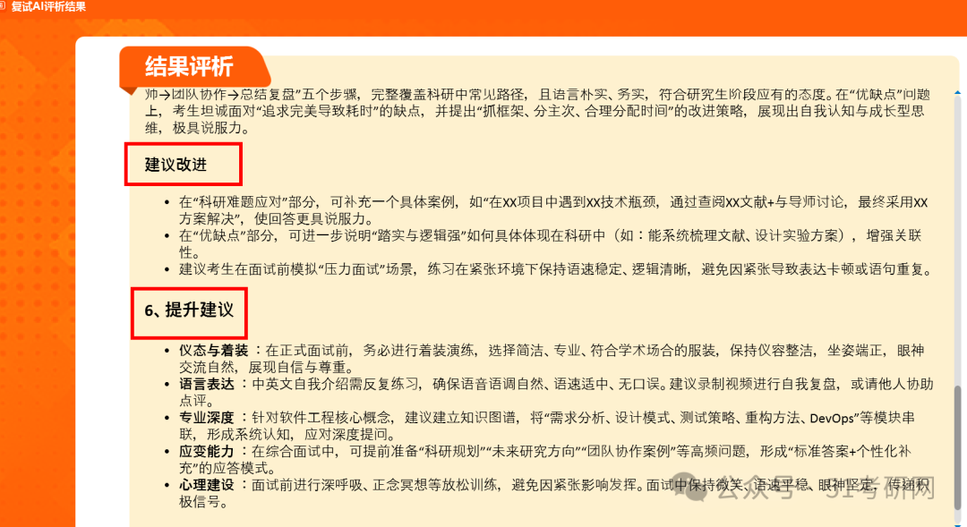重点查看结果评析,系统会根据面试的各类问题分类评析,分别评估和给出改进建议,这样可以更有针对性的提高面试水平。也可以下载报考,随时查看模拟面试的评析结果。