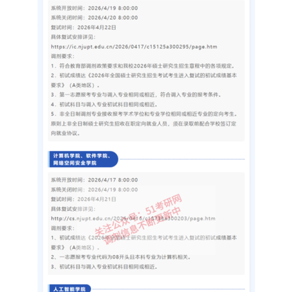 4.接到复试通知的考生务必在系统设定时限内及时在“全国硕士生招生调剂服务系统”回复确认信息。已回复确认参加复试的考生,请按学院通知要求参加资格审核、设备调试及复试,未能按时参加且多次联系考生未果的视为考生自愿放弃复试,我院不再保留其复试资格。